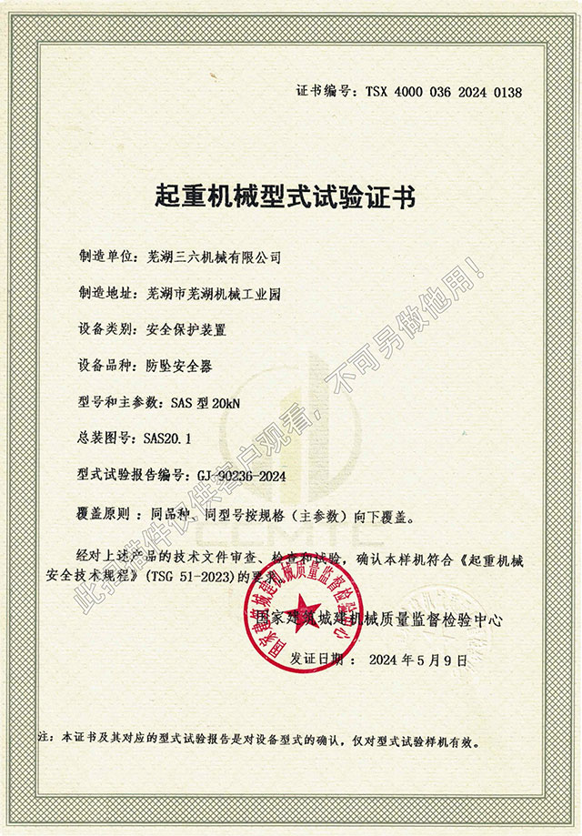 SAS型20kN防墜器型式試驗(yàn)證書(shū)